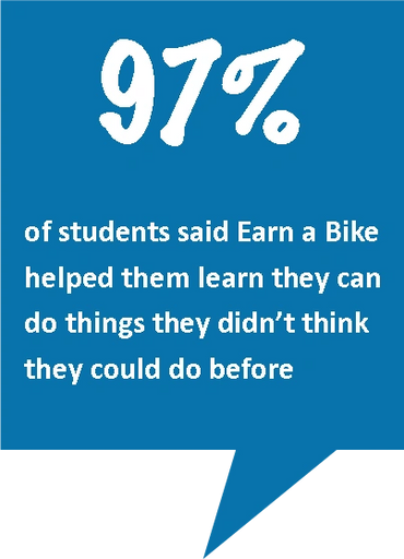 While working on their bikes, students learn teamwork, perseverance and other life skills. They see the satisfaction of turning a broken bike into a functional one, and earn their refurbished bike and new helmet!